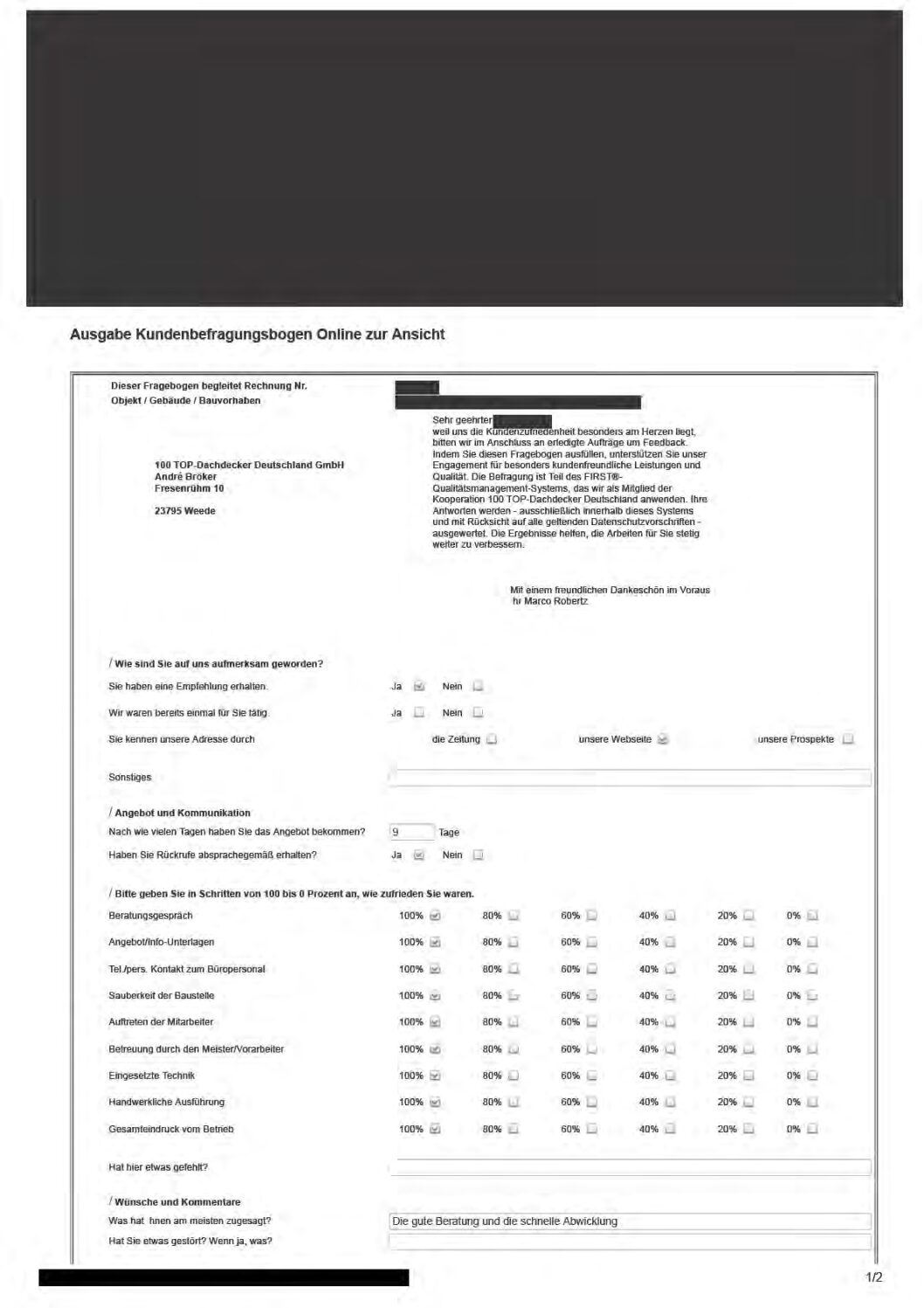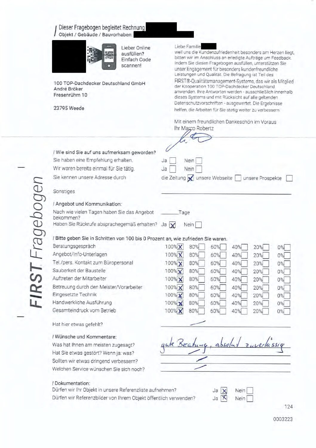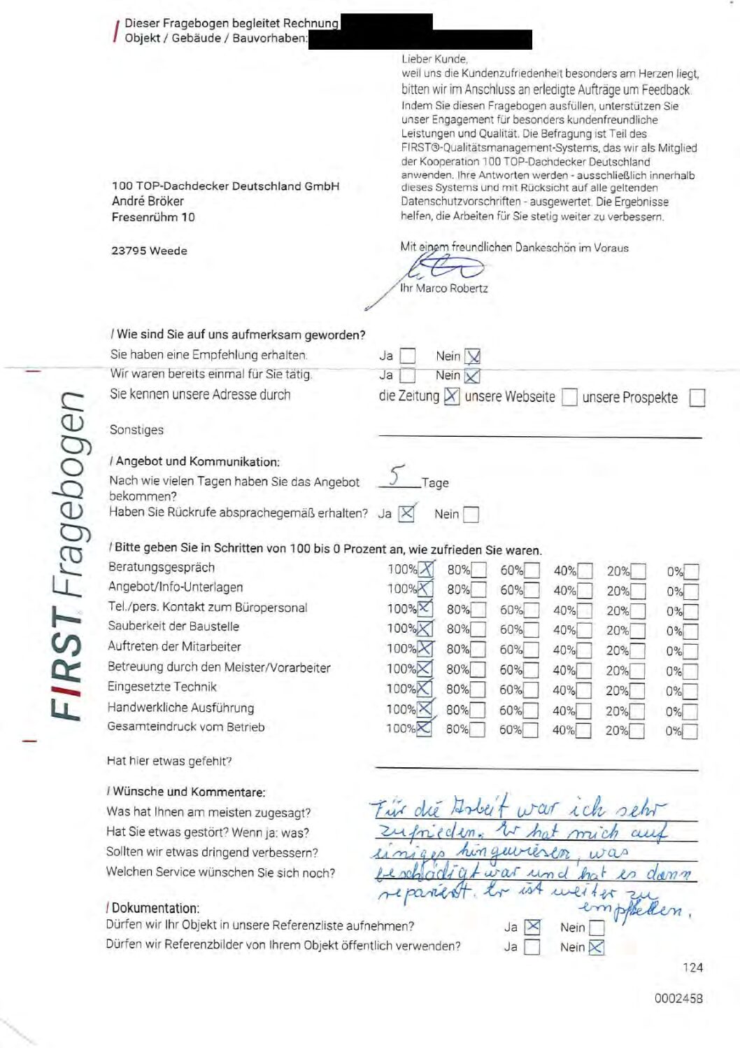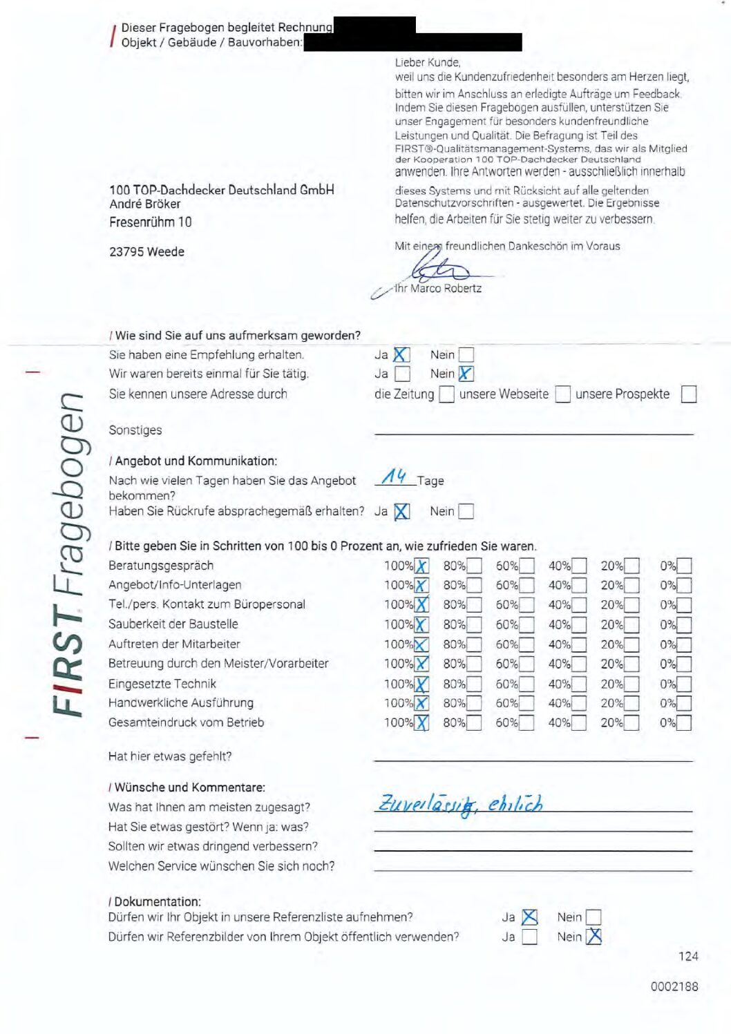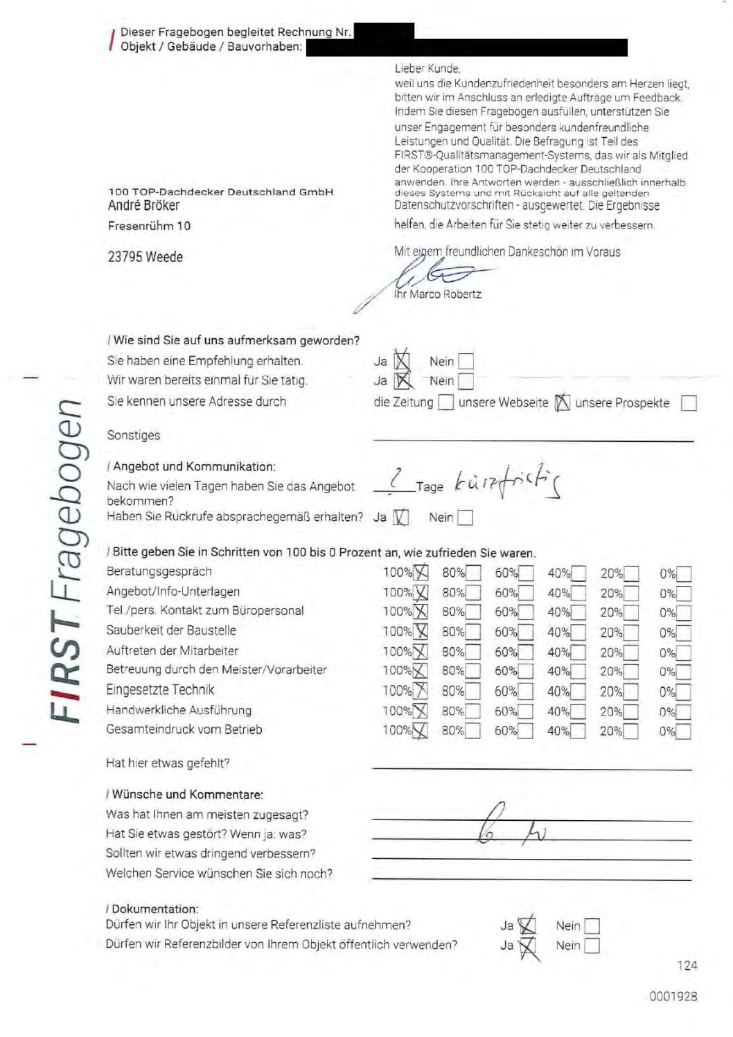 P.S. Wir haben ausnahmslos jeden Fragebogen hochgeladen, den Kunden beantwortet an die 100 Top Dachdecker Deutschland GmbH gesendet haben.