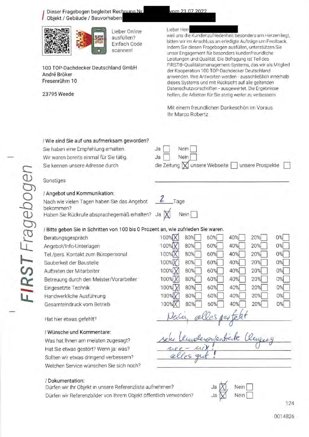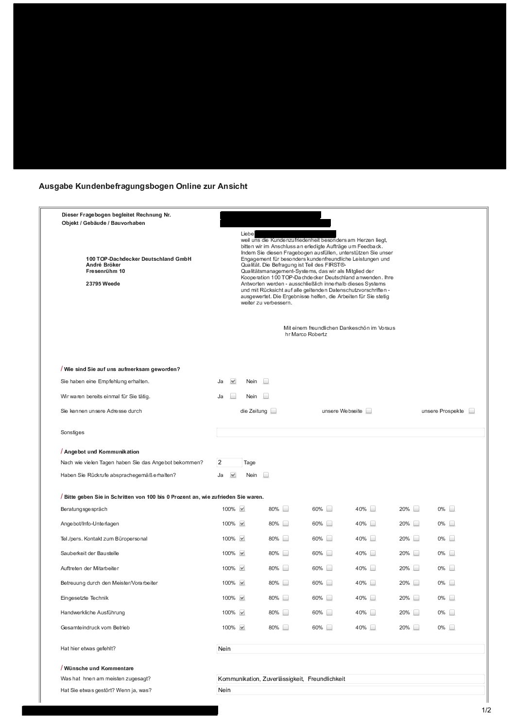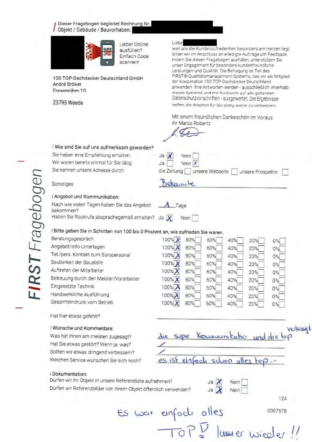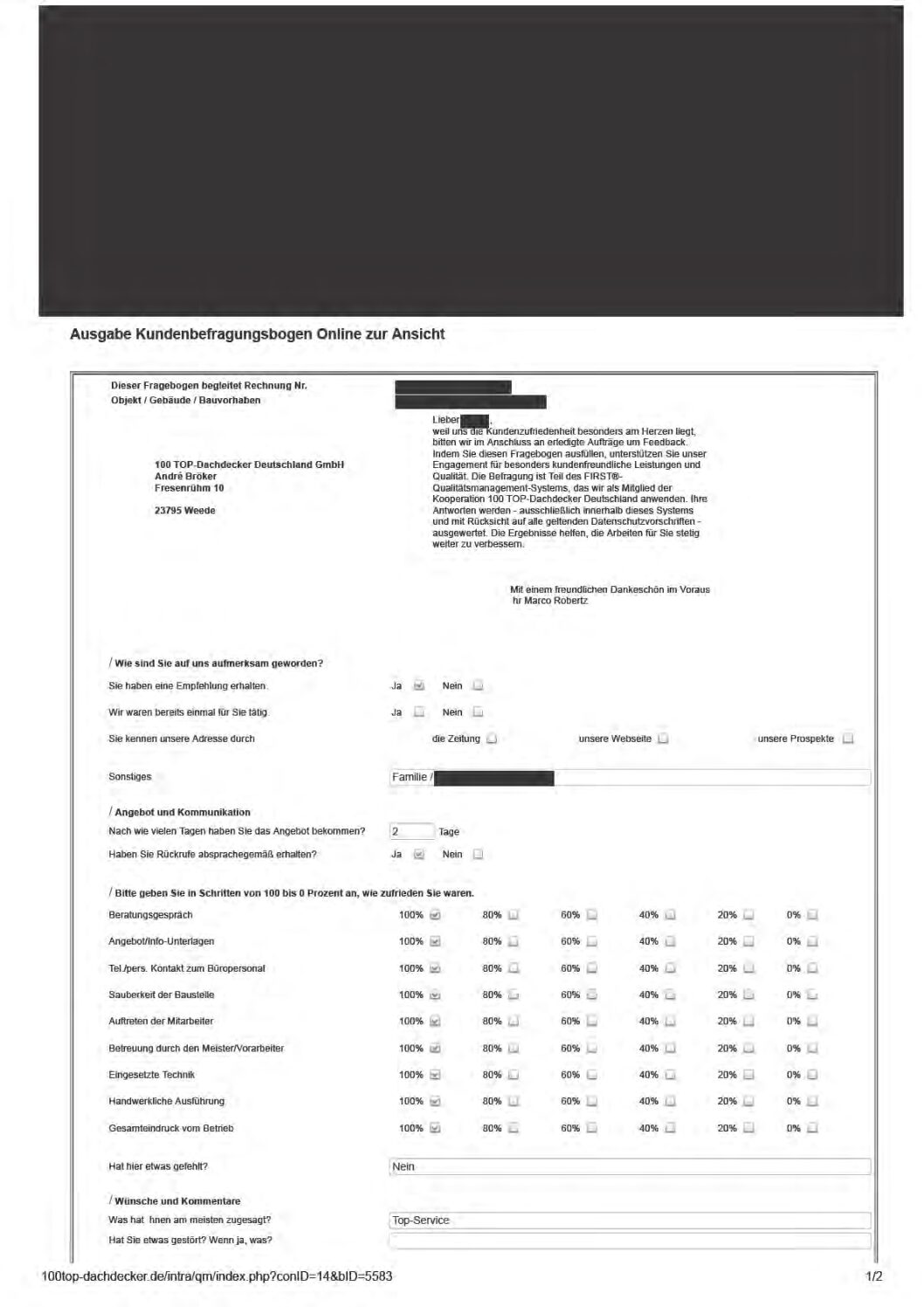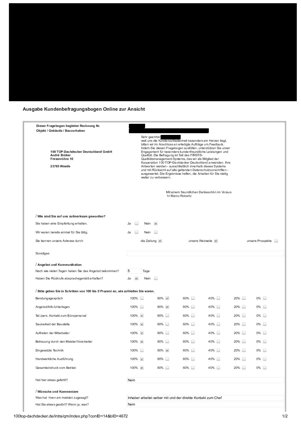 P.S. Wir haben ausnahmslos jeden Fragebogen hochgeladen, den Kunden beantwortet an die 100 Top Dachdecker Deutschland GmbH gesendet haben.