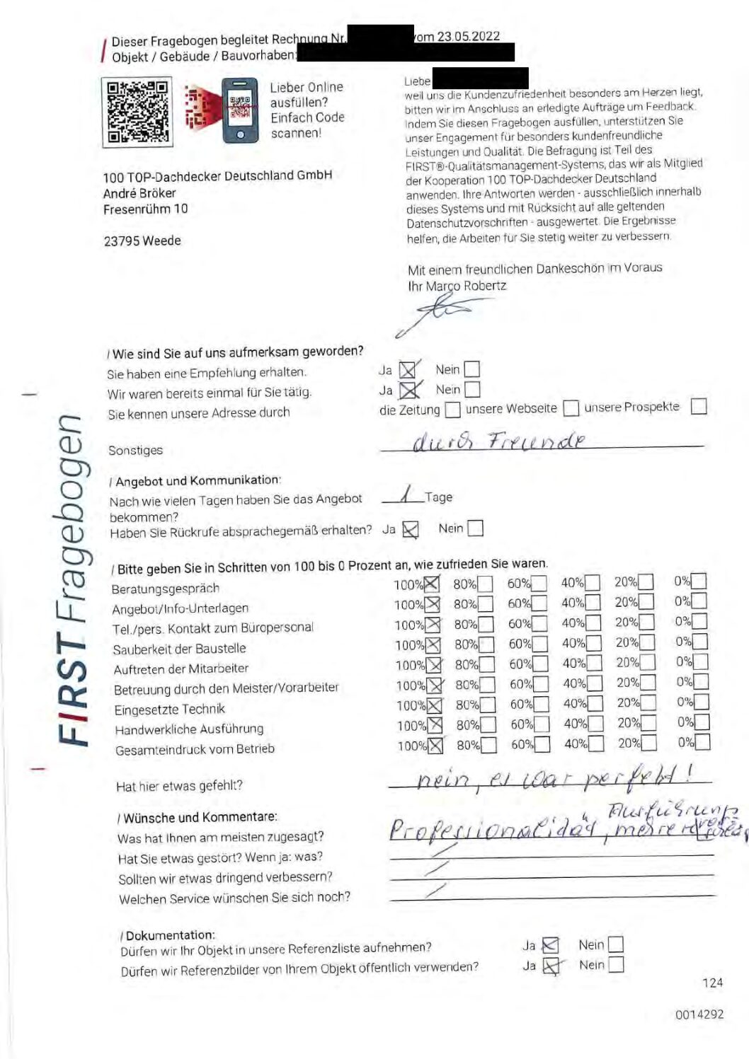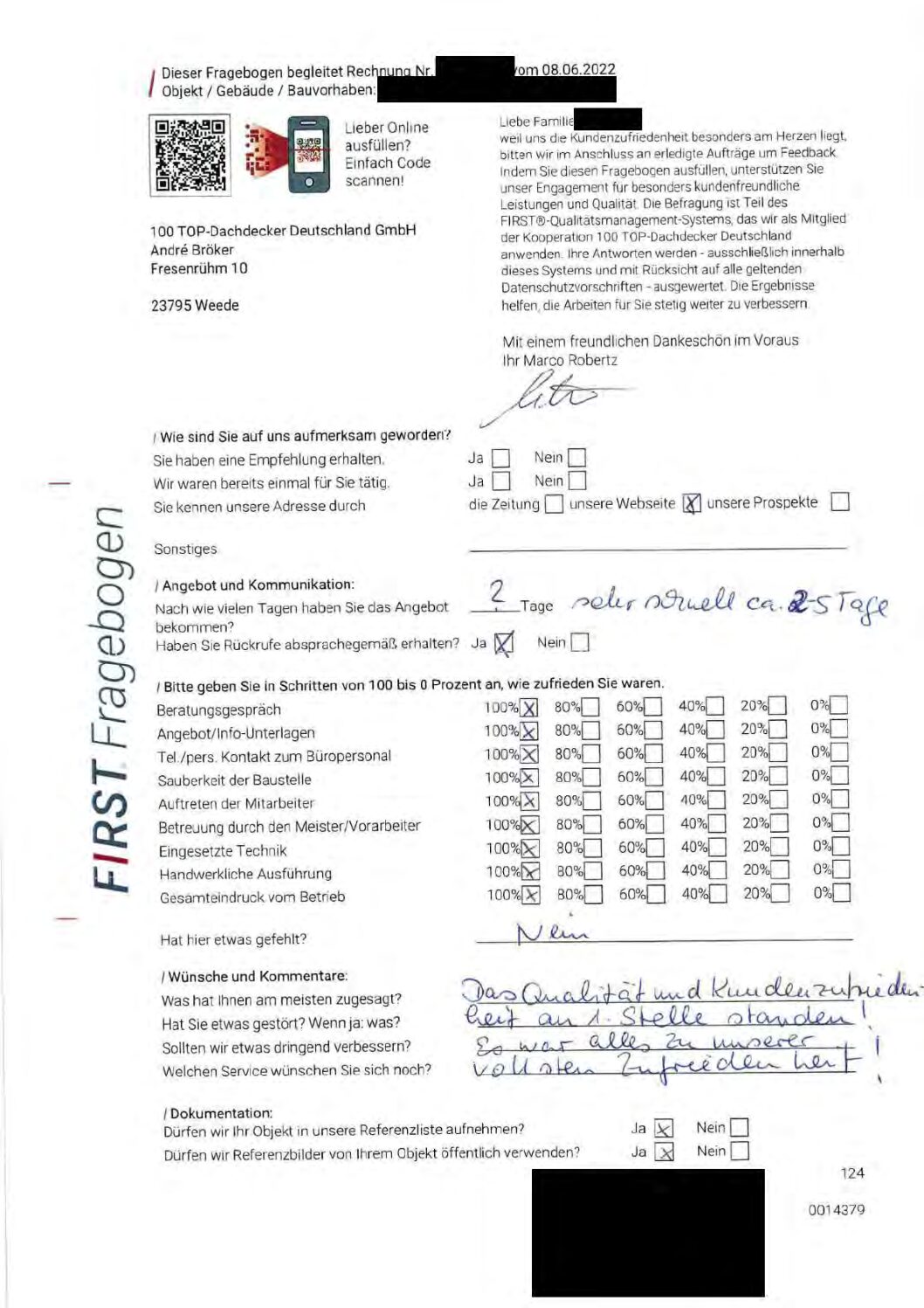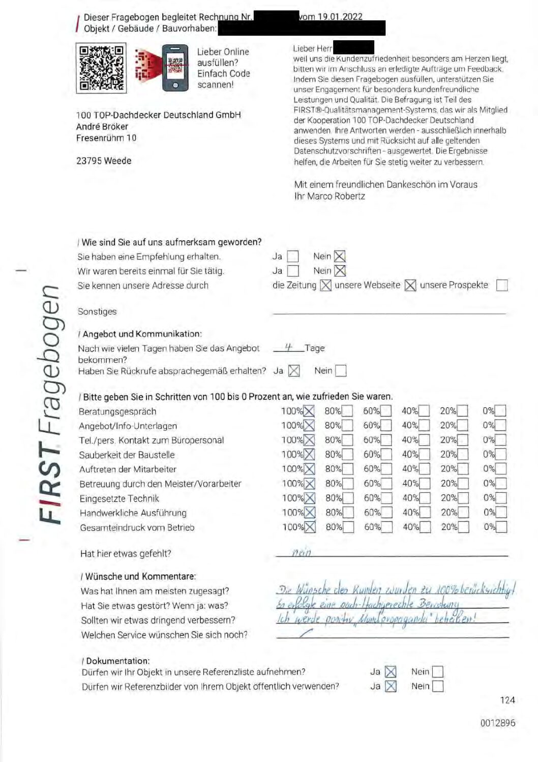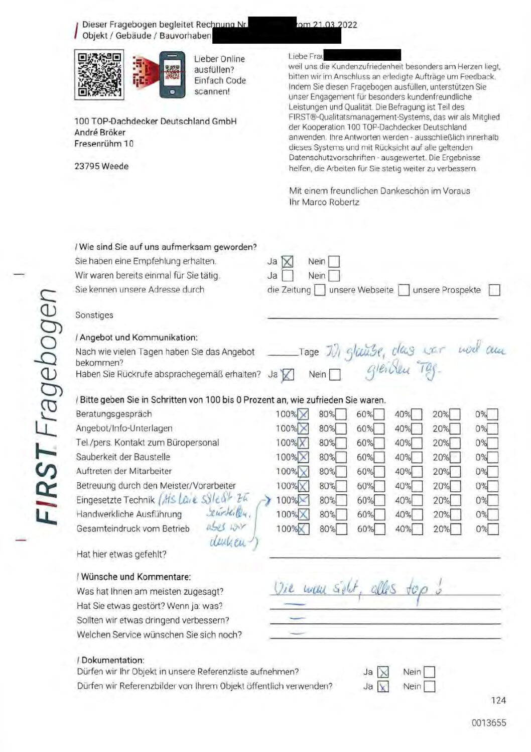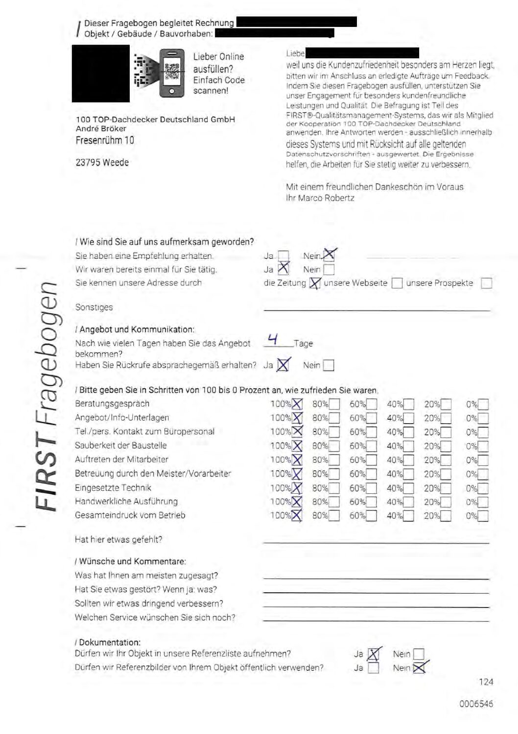 P.S. Wir haben ausnahmslos jeden Fragebogen hochgeladen, den Kunden beantwortet an die 100 Top Dachdecker Deutschland GmbH gesendet haben.