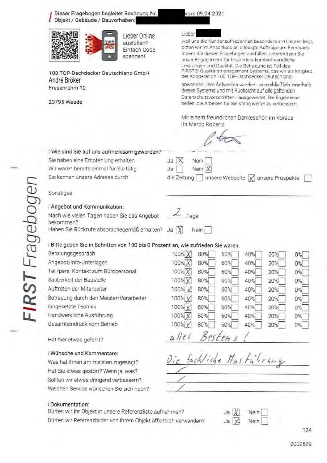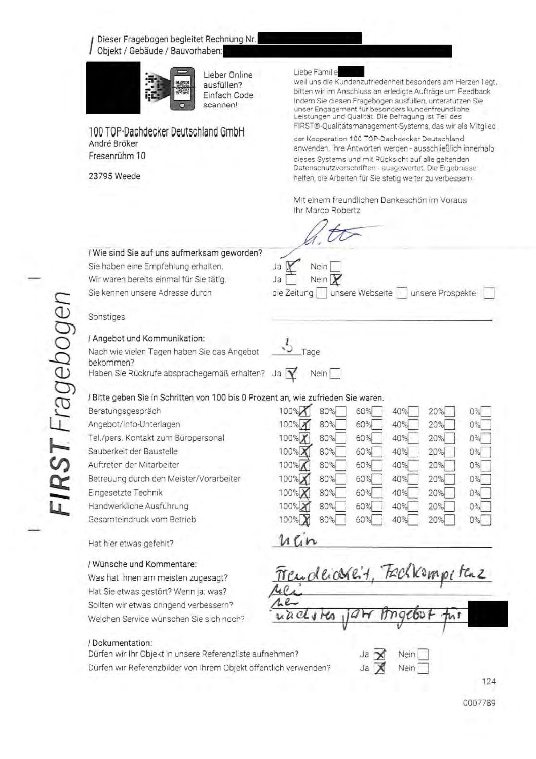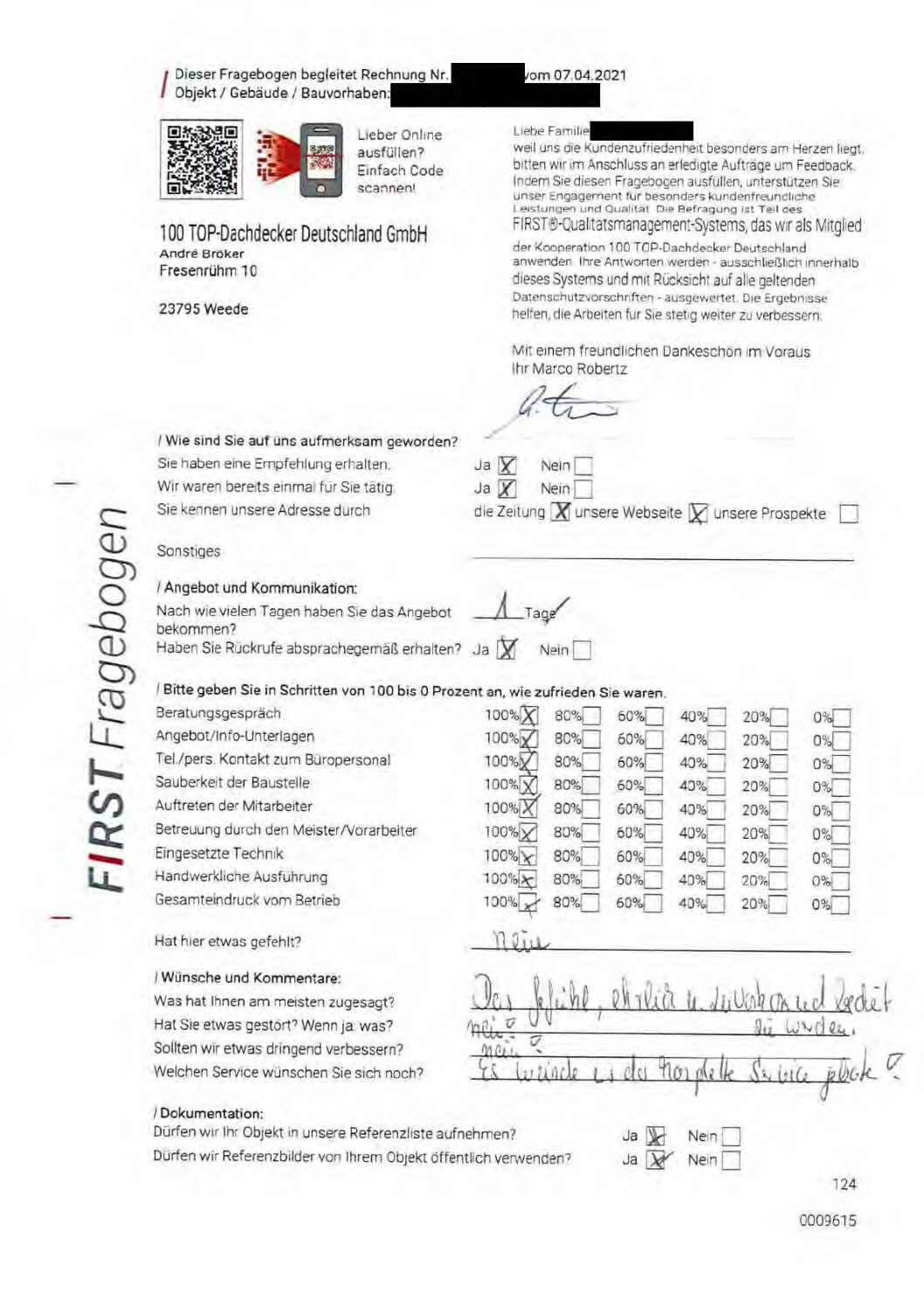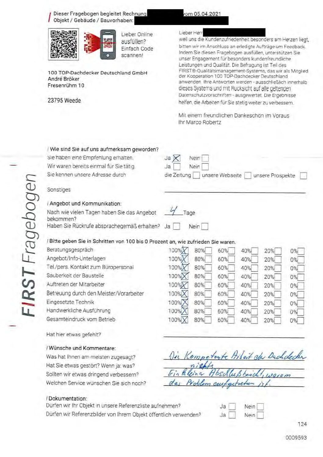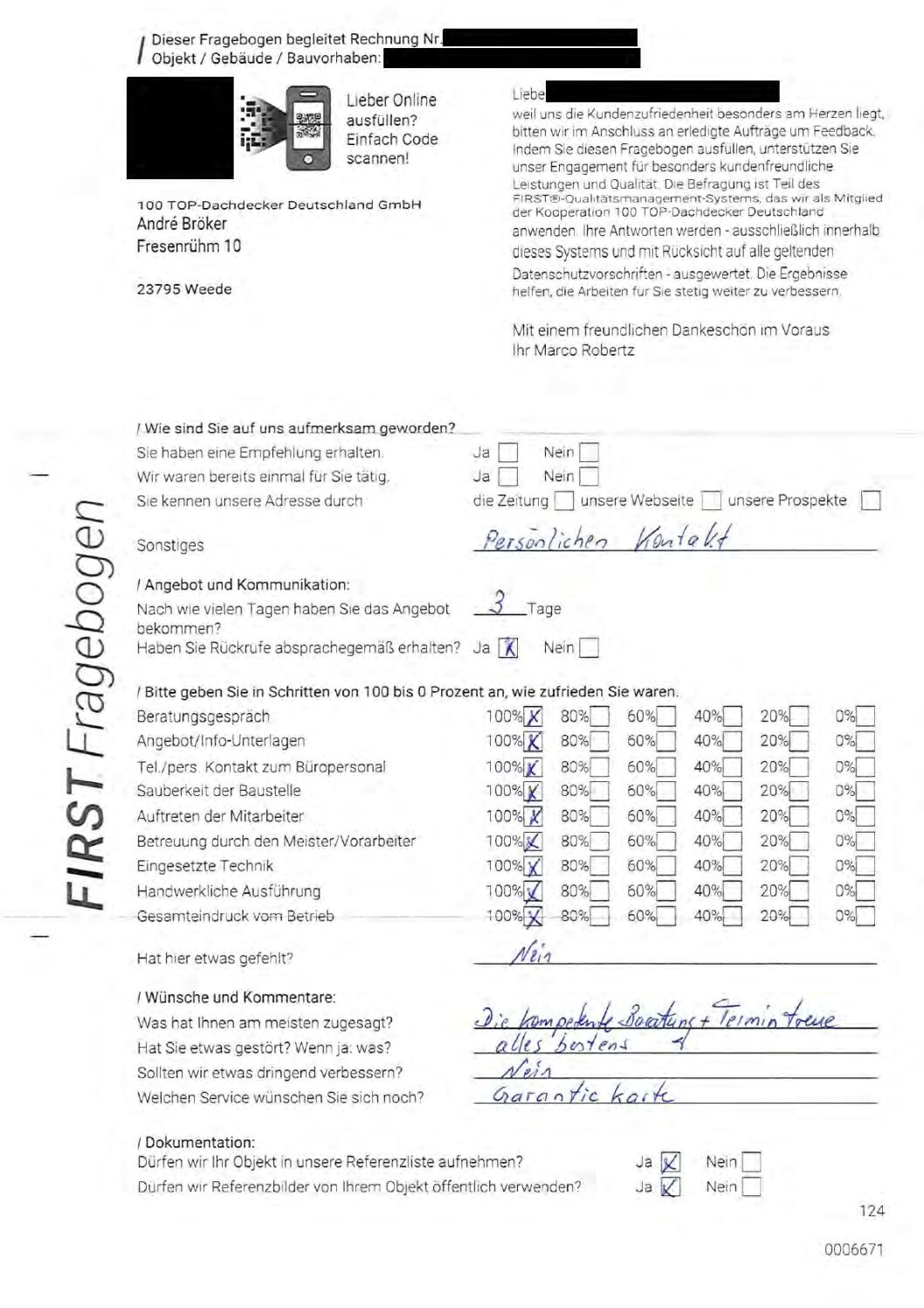 P.S. Wir haben ausnahmslos jeden Fragebogen hochgeladen, den Kunden beantwortet an die 100 Top Dachdecker Deutschland GmbH gesendet haben.