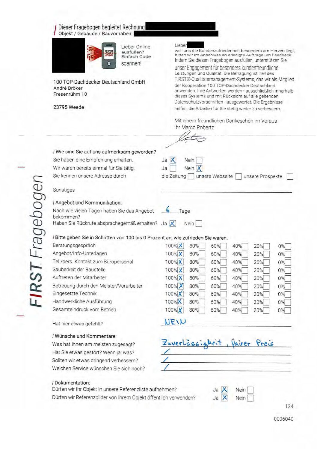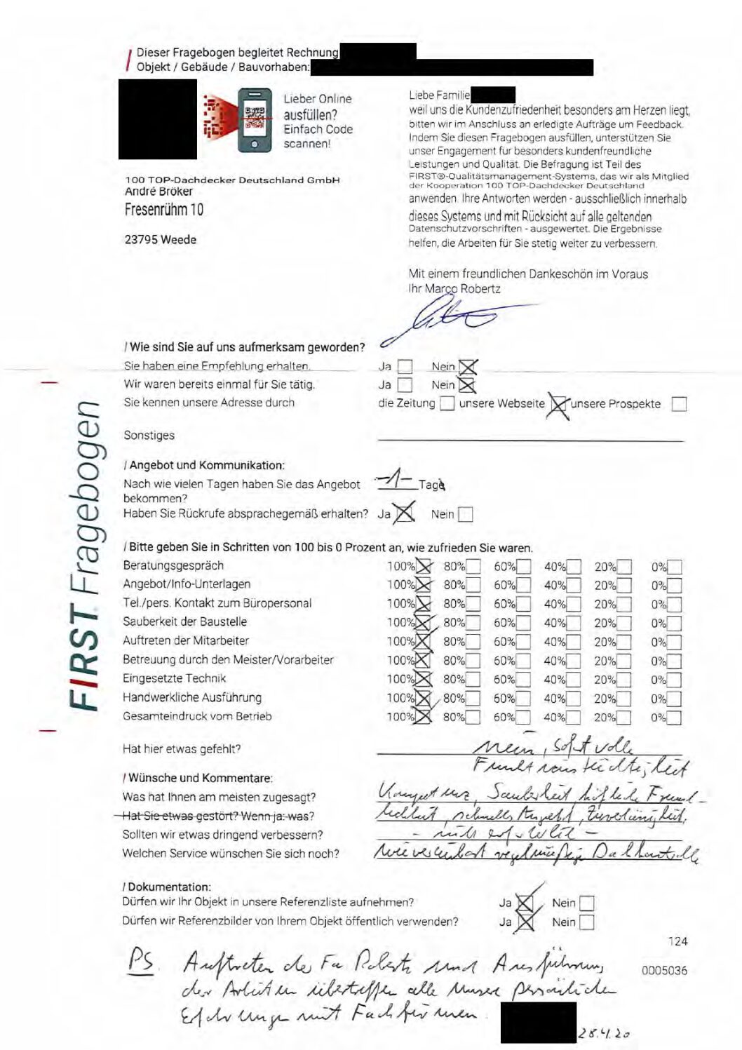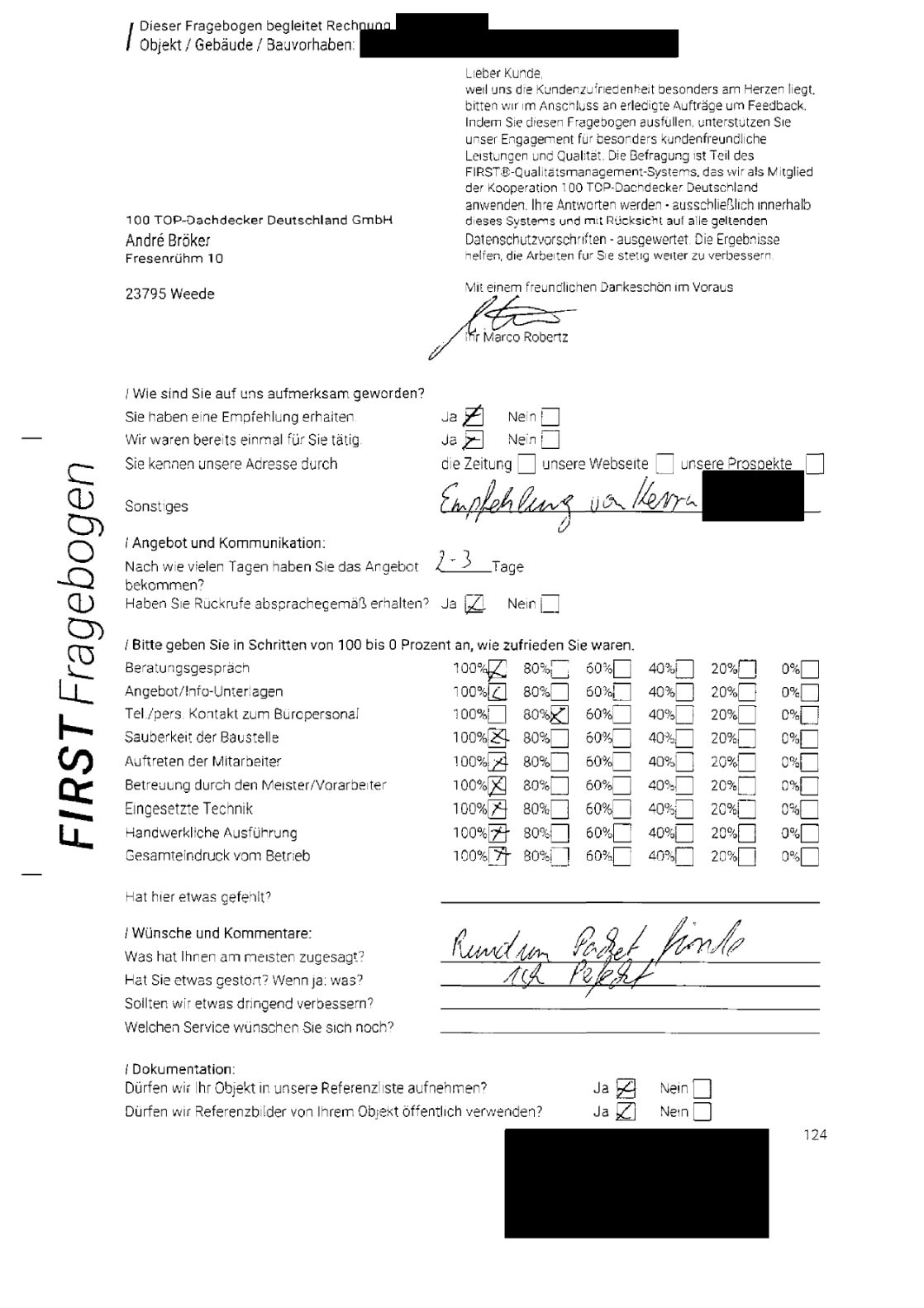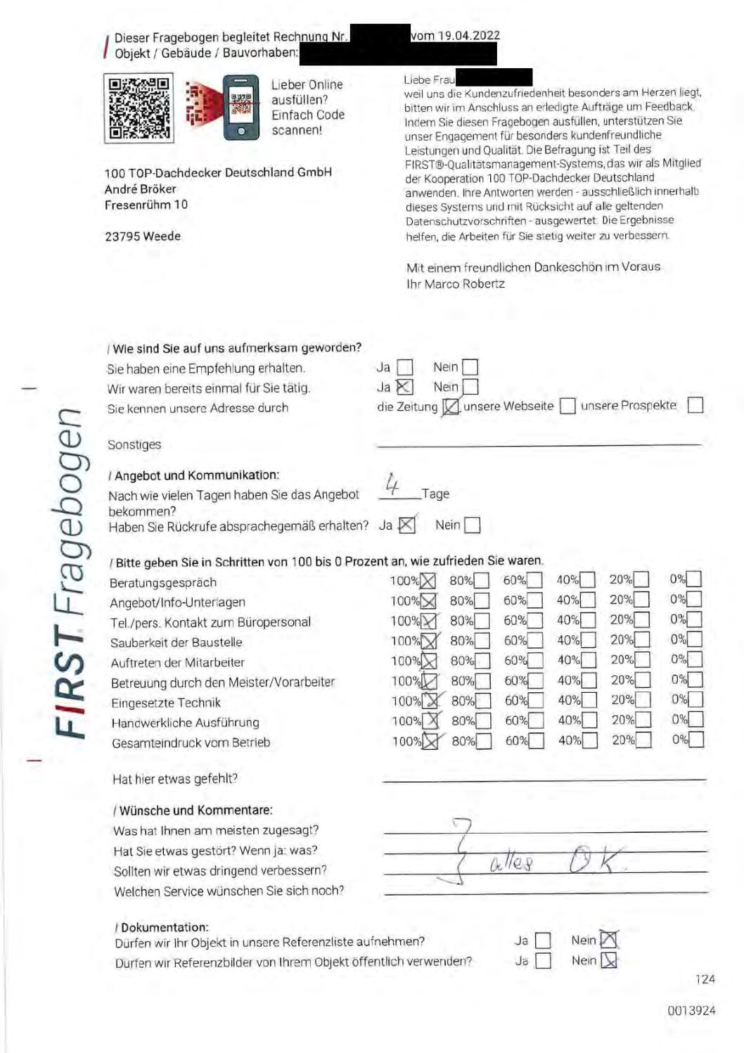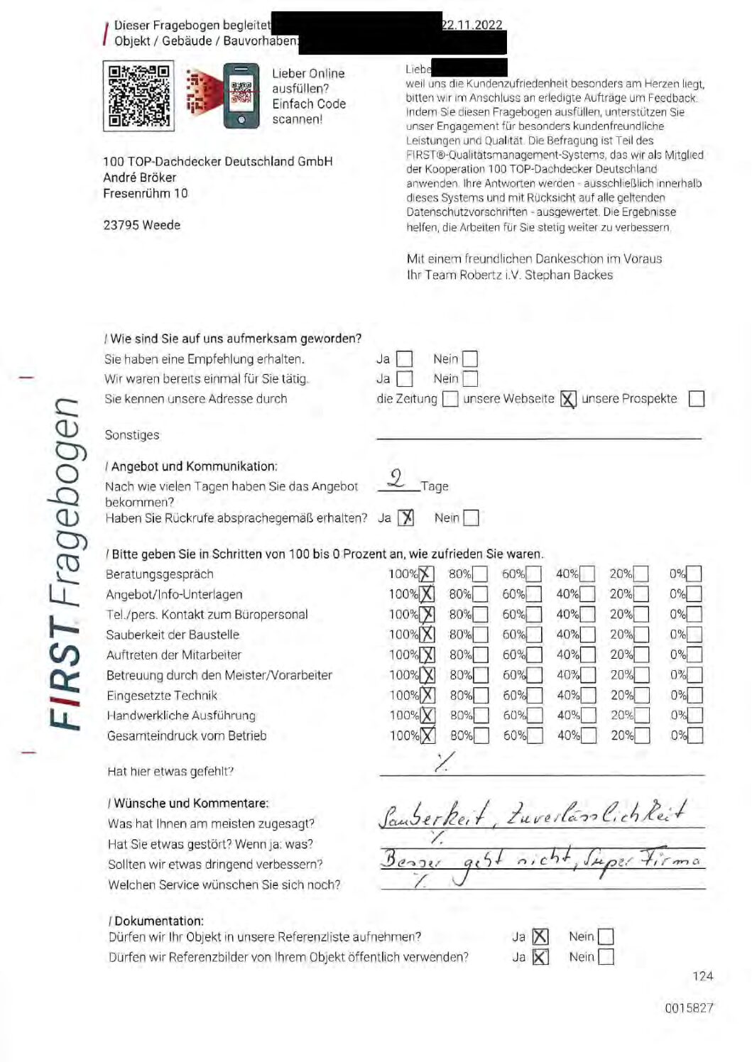 P.S. Wir haben ausnahmslos jeden Fragebogen hochgeladen, den Kunden beantwortet an die 100 Top Dachdecker Deutschland GmbH gesendet haben.